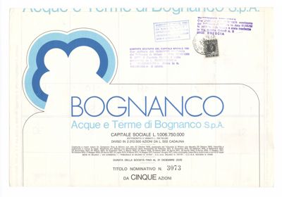 Bognanco Acque e Terme di Bognanco SpA, certificato azionario nominativo