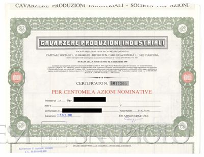 Cavarzere Produzioni Industriali SpA, certificato azionario nominativo