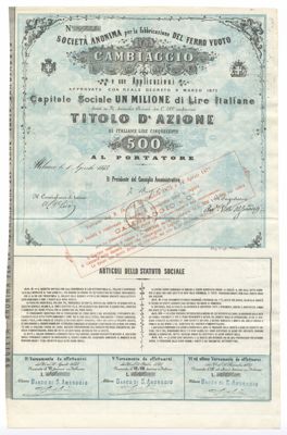Cambiaggio per la fabbricazione del ferro vuoto e sue applicazioni SA, certificato azionario al portatore