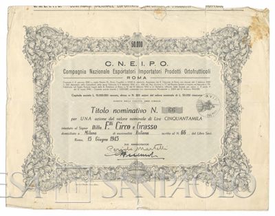 CNEIPO Compagnia nazionale esportatori importatori prodotti ortofrutticoli, certificato azionario nominativo
