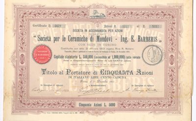 Ceramiche di Mondovì - Ing. E. Barberis Società in Accomandita per azioni, certificato azionario al portatore