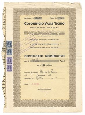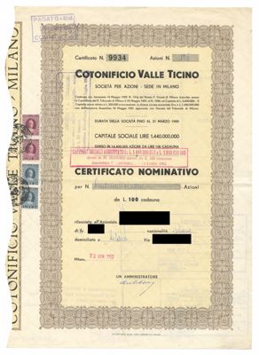 Cotonificio Valle Ticino SpA, certificati azionari nominativi