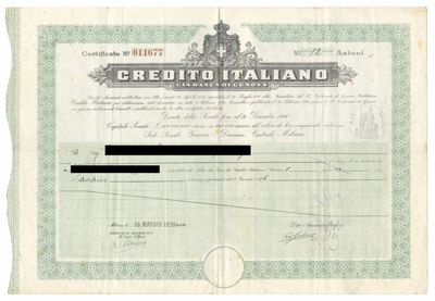 Credito Italiano (già Banca di Genova) SA, certificato azionario nominativo