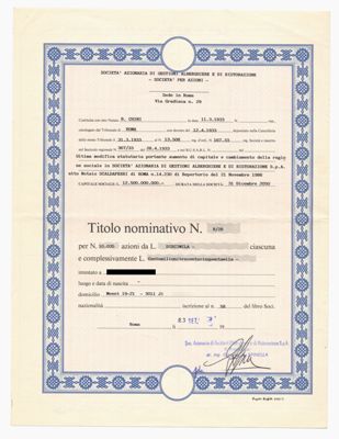 Gestioni alberghiere e di ristorazione SpA, certificato azionario nominativo