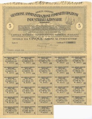 Gestione Amministrazione compartecipazioni industriali azionarie SA SAGACIA, certificati azionari al portatore