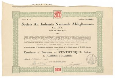 Industria Nazionale abbigliamento SAINA SA, certificato azionario al portatore