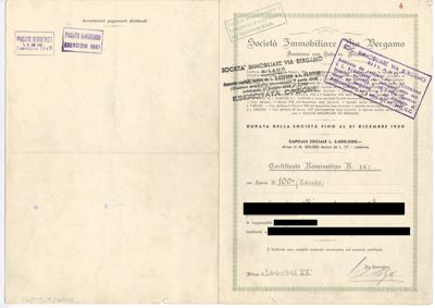 Immobiliare Via Bergamo SA, certificato azionario nominativo