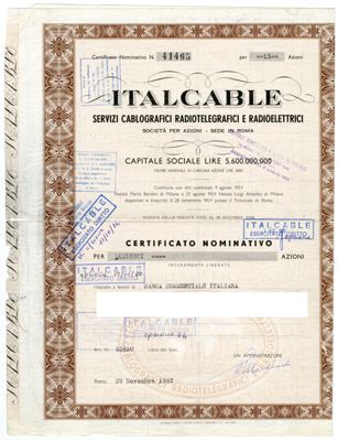 ITALCABLE Servizi cablografici radiotelegrafici e radioelettrici SpA, certificati azionari nominativi