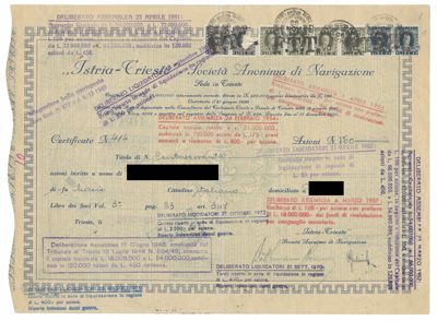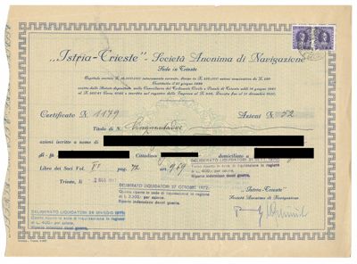 Istria-Trieste Società di navigazione SA, certificati azionari nominativi