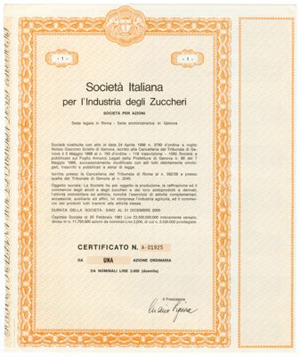 Italiana industria degli Zuccheri SpA, certificato azionario nominativo