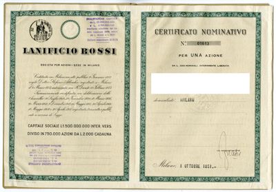 Lanificio Rossi SpA, certificato azionario nominativo
