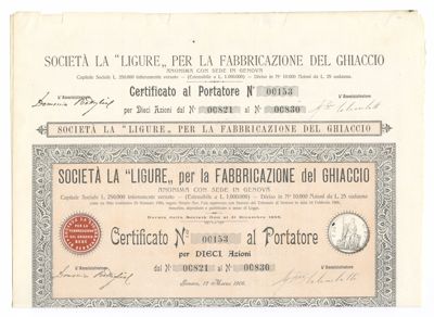 Ligure per la Fabbricazione del Ghiaccio SA, certificati azionari al portatore