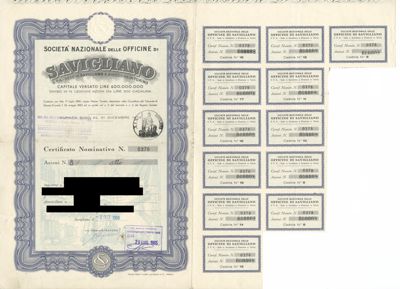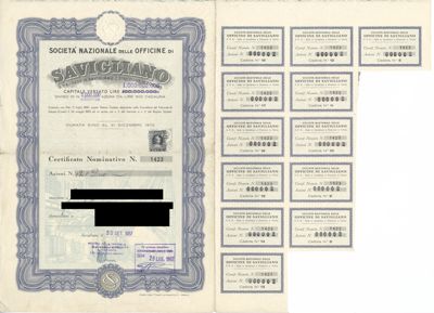 Officine di Savigliano Società Nazionale SpA, certificato azionario nominativo
