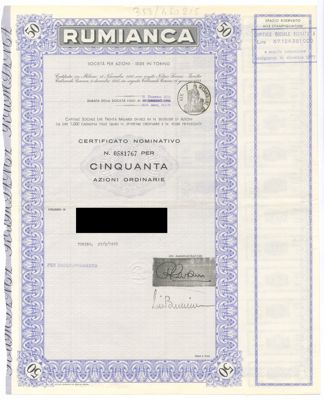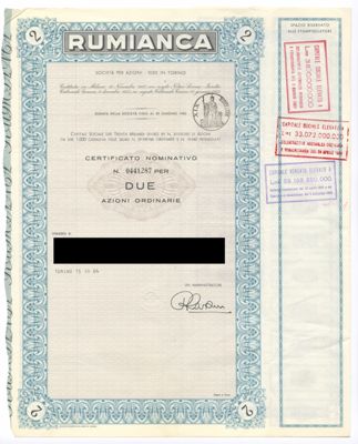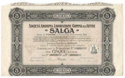 SALGA Società Anonima Lavorazione Gomma ed Affini, certificati azionari al portatore