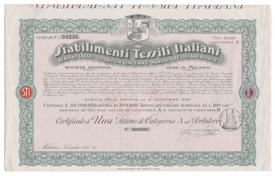 Stabilimenti Tessili Italiani Benigno Crespi - Cotonificio Veneziano - Manifatture Toscane Riunite SA, certificati azionari al portatore