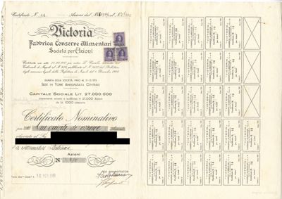 Victoria Fabbrica Conserve Alimentari SpA, certificato azionario nominativo