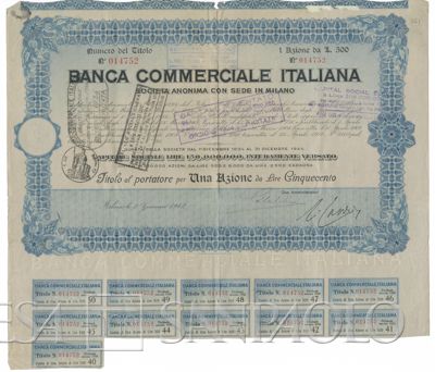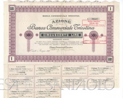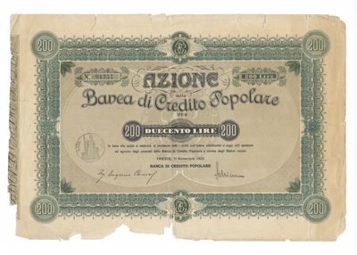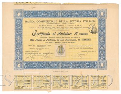 Banca Commerciale della Seteria Italiana Anonima Cooperativa, certificato azionario al portatore della Velluti di Zoagli SA