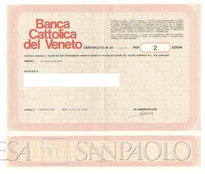 Banca Cattolica del Veneto SpA, certificato azionario nominativo