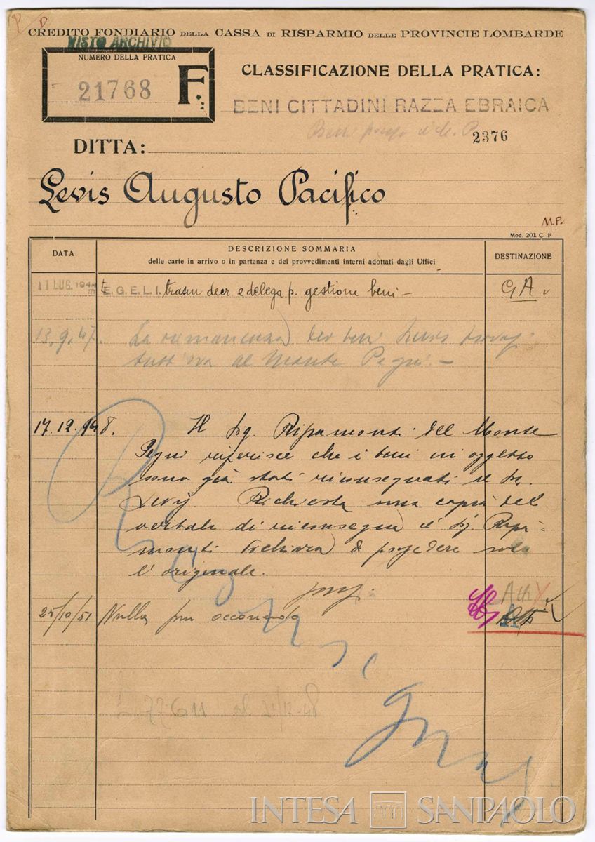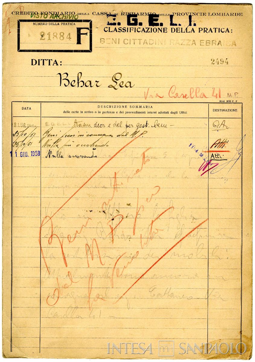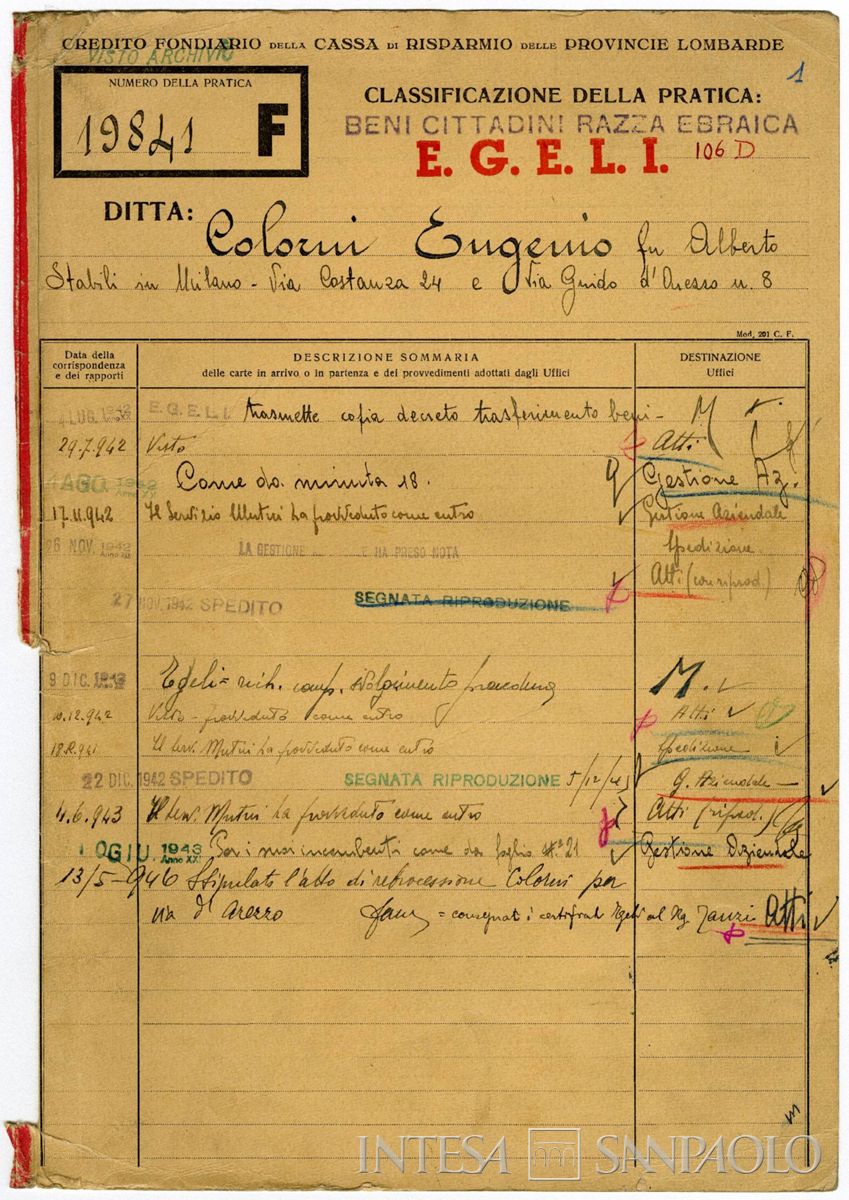 Dopo il 1943, con l’occupazione tedesca e la nascita della Repubblica Sociale Italiana, alla persecuzione delle vite si affiancarono il sequestro sistematico e la confisca di beni mobili e immobili: abitazioni, oggetti d’uso quotidiano, arredi, opere d’arte, titoli e azioni. La gestione della spoliazione fu affidata all’EGELI, ente governativo istituito nel 1939, che per la Lombardia operò attraverso il Credito Fondiario della Cassa di Risparmio delle Provincie Lombarde e, dal 1944, il Monte di Credito su Pegno di Milano, che conservava nei propri magazzini i beni sottratti e valutava il valore di mobili e oggetti.